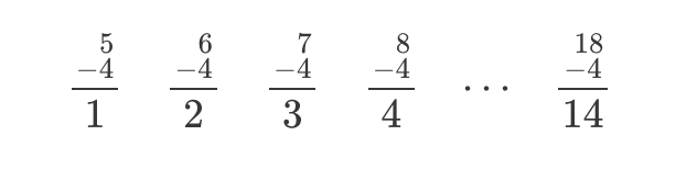 Let’s take the above list from 5 to 18 and turn it into a list that we know how to count by subtracting 4 from every number (I first saw this approach in David Patrick’s book Introduction to Counting & Probability. A great resource if you enjoy these kinds of problems.):
