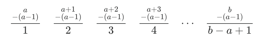 Using the same trick, we subtract a - 1 from each number in the range from a to b. This transforms it into a list we can count easily, starting from 1: