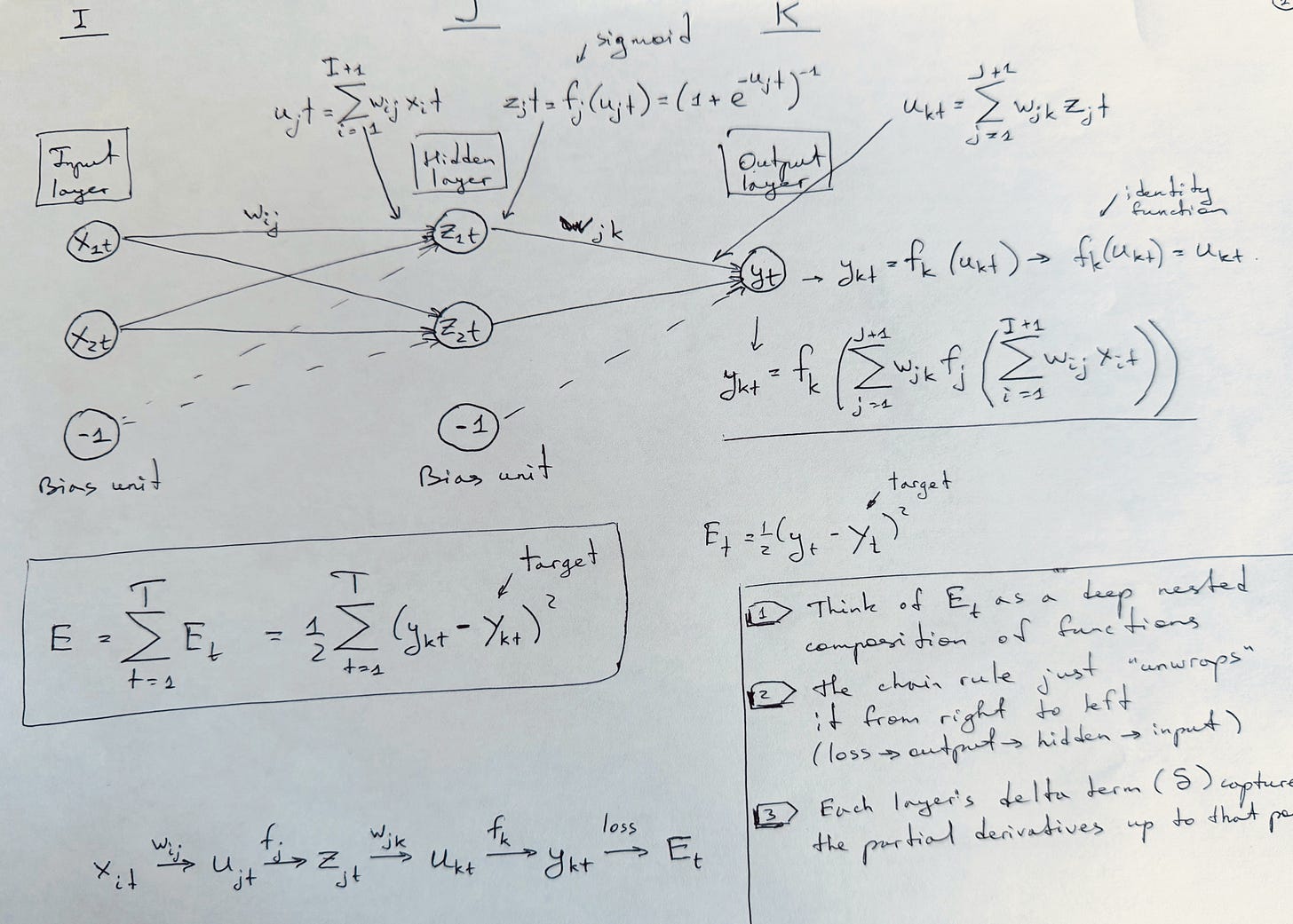 I revisited the chain rule for functions with several variables, and I’m currently going through the forward pass math in a simple 2-2-1 perceptron with a sigmoid activation in the hidden layer.